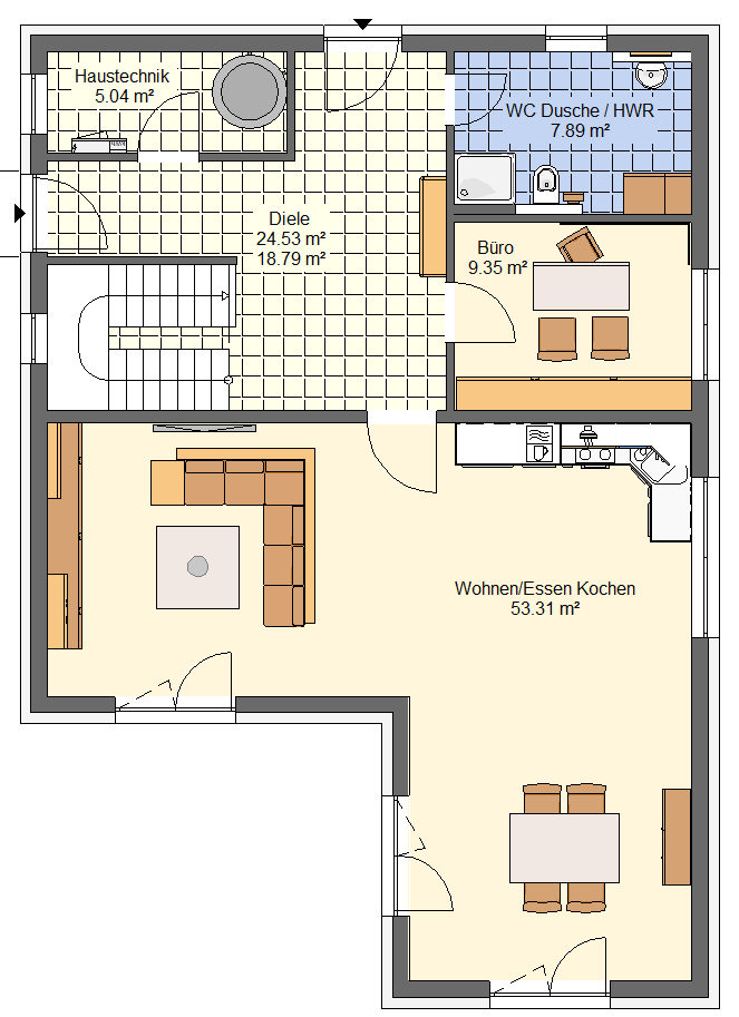 Hausabmessungen 10,23 m x 10,23 m zuzüglich Anbau 4,16 mx 4,93 m